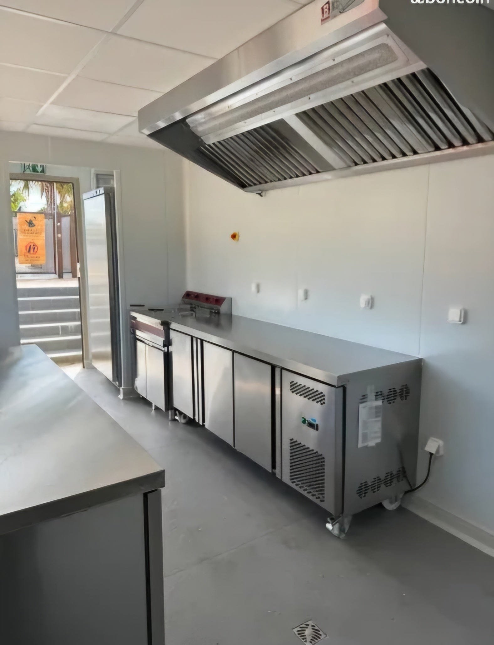 Cocción y Extracción: Freidora doble profesional de 14L en acero inoxidable y campana extractora industrial de 2 metros.